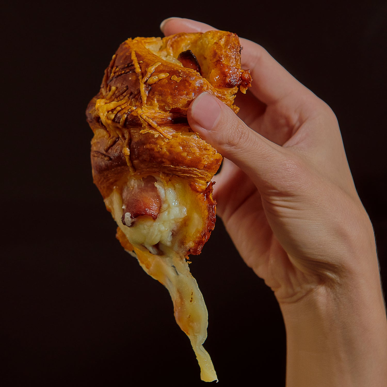 Inspired by the Croque Monsieur, we combine a very aromatic dough with a classic salty flavor. Rolled with ham, Gruyère, Mornay sauce, and a touch of honey mustard, then baked with more Gruyère on top.