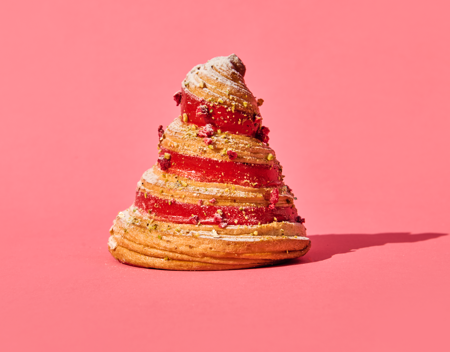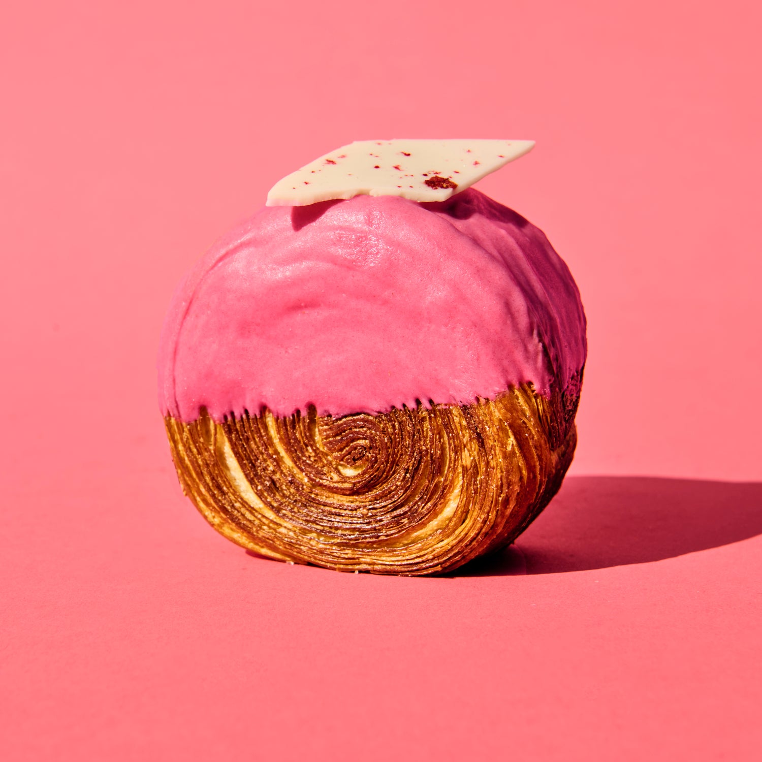 Flaky, buttery layers filled with silky strawberry white chocolate cream, topped with a strawberry white chocolate glaze and a crisp strawberry meringue shard.
