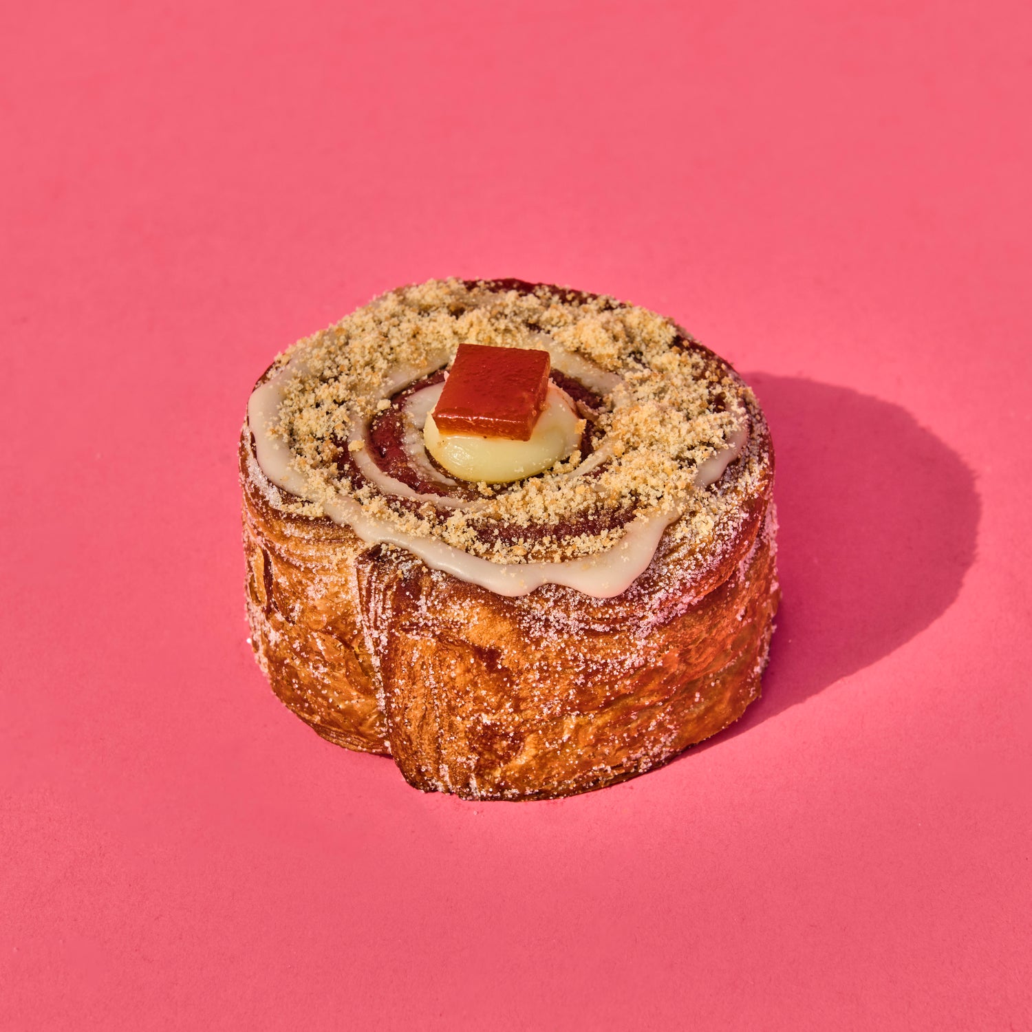 A buttery, flaky MY roll coated in sugar, filled with rich mascarpone and sweet guava jam. It's topped with a swirl of guava and vanilla glaze, a dollop of creamy mascarpone, a slice of bocadillo(guava paste),and a sprinkle of crushed crackers for the perfect balance of sweetness and crunch