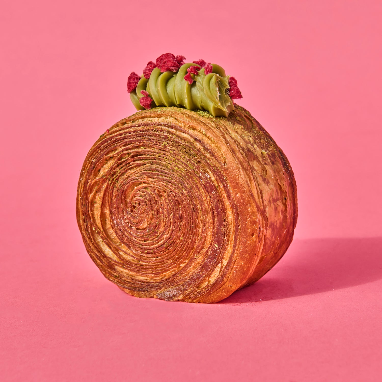 Our twist on the viral New York Roll! A buttery croissant roll filled with silky matcha ganache and a tangy raspberry-lime jam that’ll make your taste buds dance. Finished with a sprinkle of matcha powder, more matcha ganache and a pop of lyophilized raspberries.