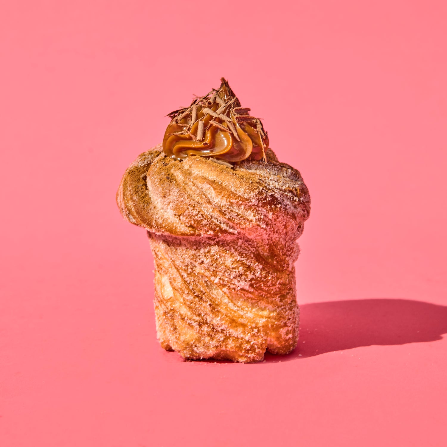 A golden, flaky cruffin filled with rich, creamy dulce de leche, dusted with cinnamon, and
